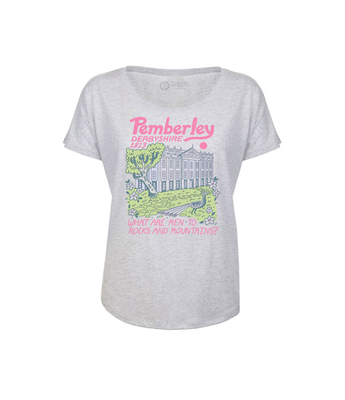 The Pride and Prejudice Pemberley women's t-shirt, featuring one of Jane Austen's most iconic quotes: "What are men to rocks and mountains?" Inspired by the grandeur of Mr. Darcy's estate from the timeless classic, this relaxed fit shirt is a must-have for any Austen aficionado. Product Details -Cotton/poly wide neck tee-Color: heather white Size & Fit -Relaxed fit